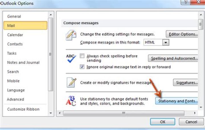 - In Outlook 2010 / 2013, click the Mail button in the left bar, and the Stationery and Fonts button stays in the Compose messages section.