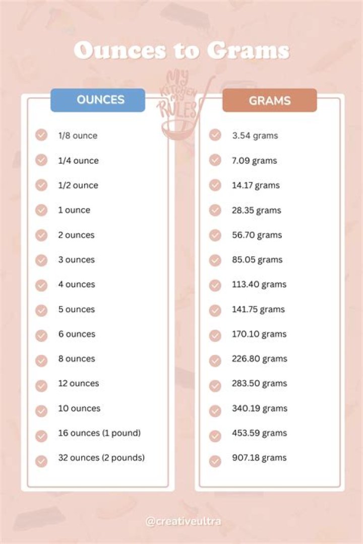 Convert ounces to grams by using the conversion factor of 1 ounce to 28 grams.