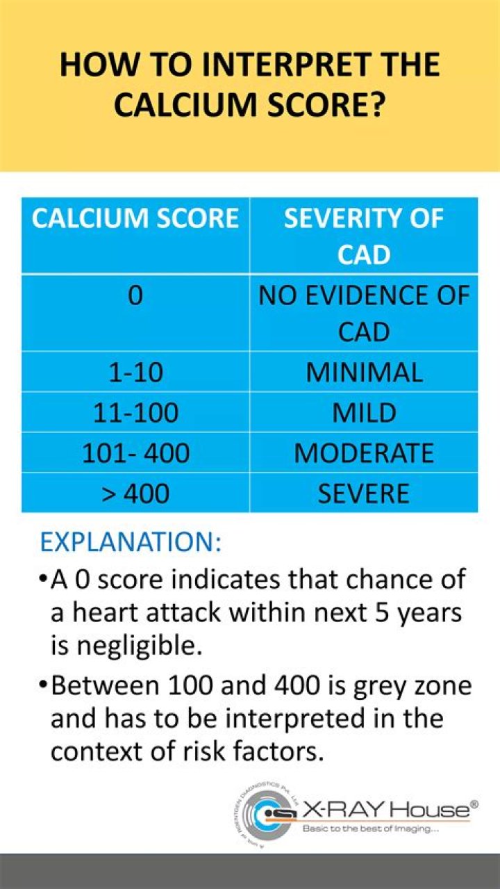 The lower the score, the less calcium, and in general, the less likelihood of a heart attack or stroke (see “What your calcium score means”)….