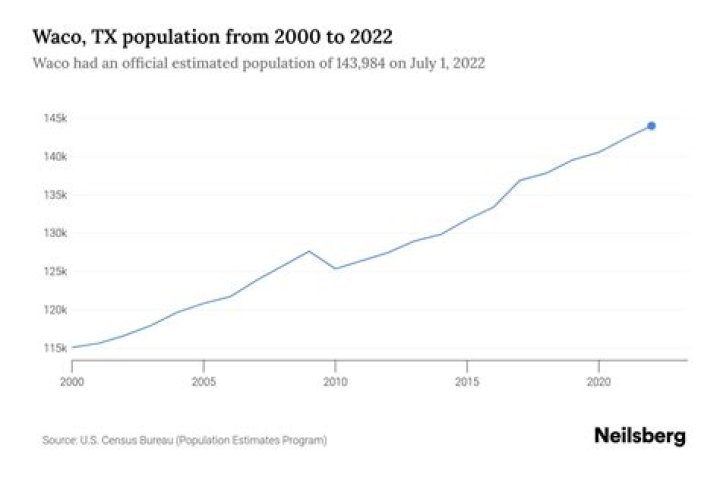 Waco is currently growing at a rate of 0.96% annually and its population has increased by 13.73% since the most recent census, which recorded a population of 124,805 in 2010. Waco reached it’s highest population of 141,936 in 2021.