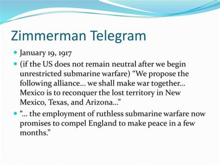 The telegram said that if Germany went to war with the United States, Germany promised to help Mexico recover the territory it had lost during the 1840s, including Texas, New Mexico, California, and Arizona.